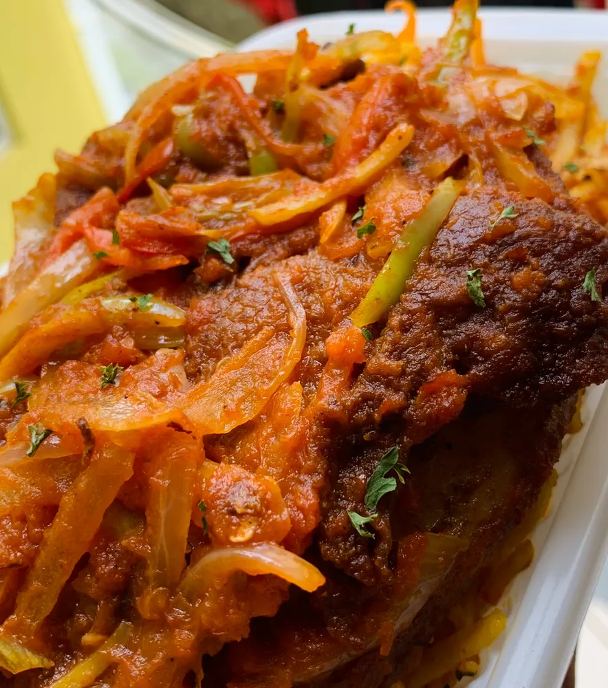PEPPERED PORK WITH JOLLOF PASTA